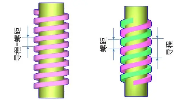 单线螺纹时,导程=螺距;多线螺纹时,导程=螺距×线数。