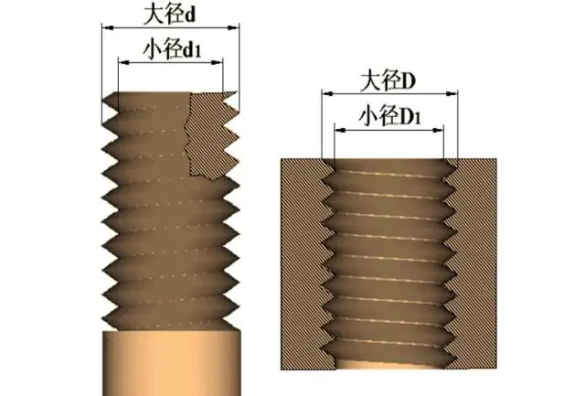 螺纹有大径(d、D)、中径(d2、D2)、小径(d1、D1),在表示螺纹时采用的是公称直径,公称直径是代表螺纹尺寸的直径。