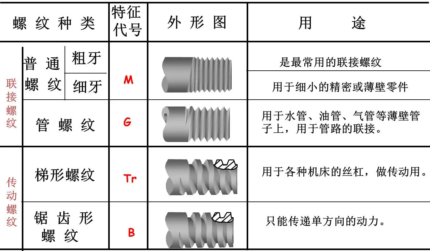 按牙型可分为三角形、梯形、矩形、锯齿形和圆弧螺纹;
